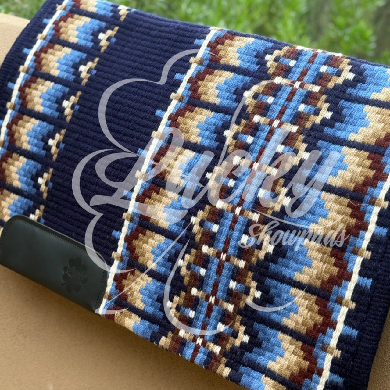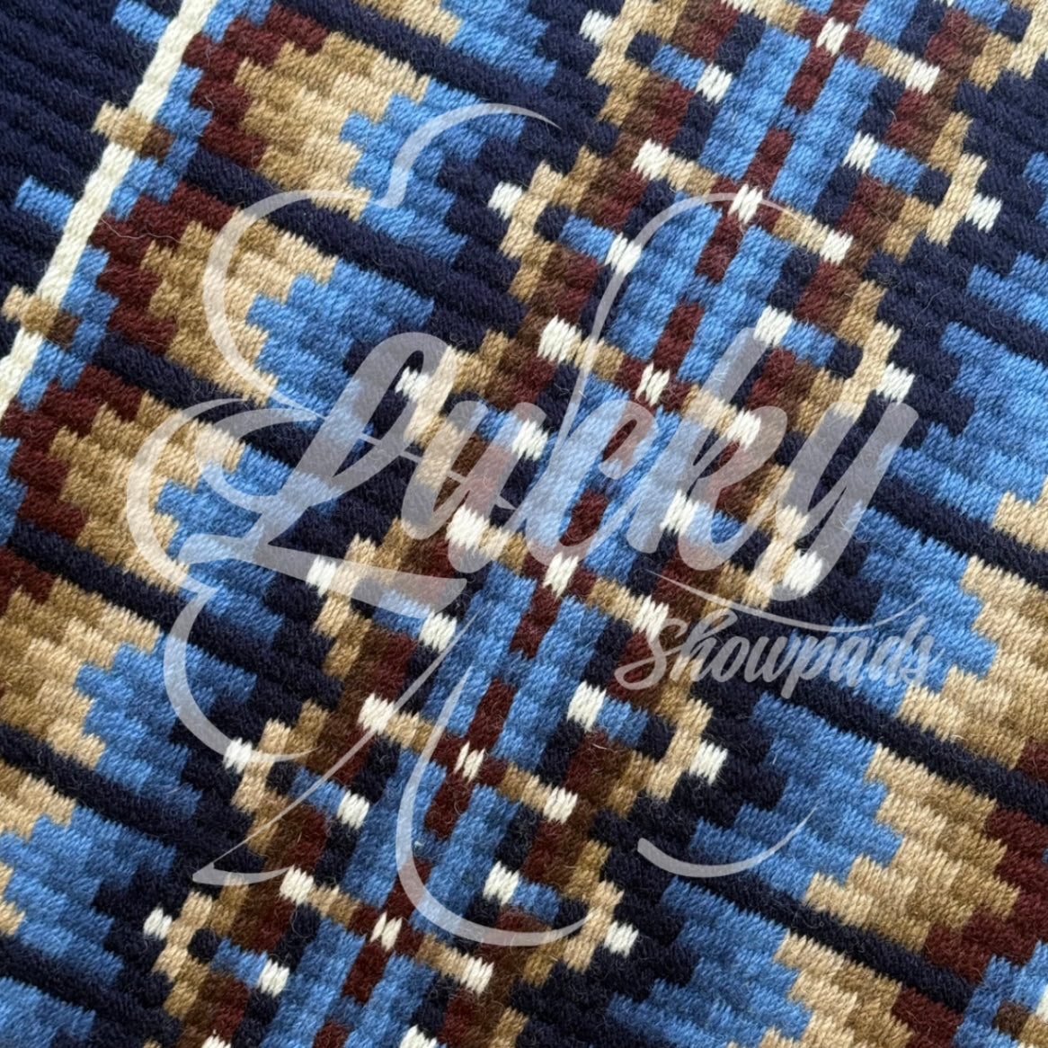 (Deep navy base, slate blue, periwinkle, cream, sand, tan, burgundy)