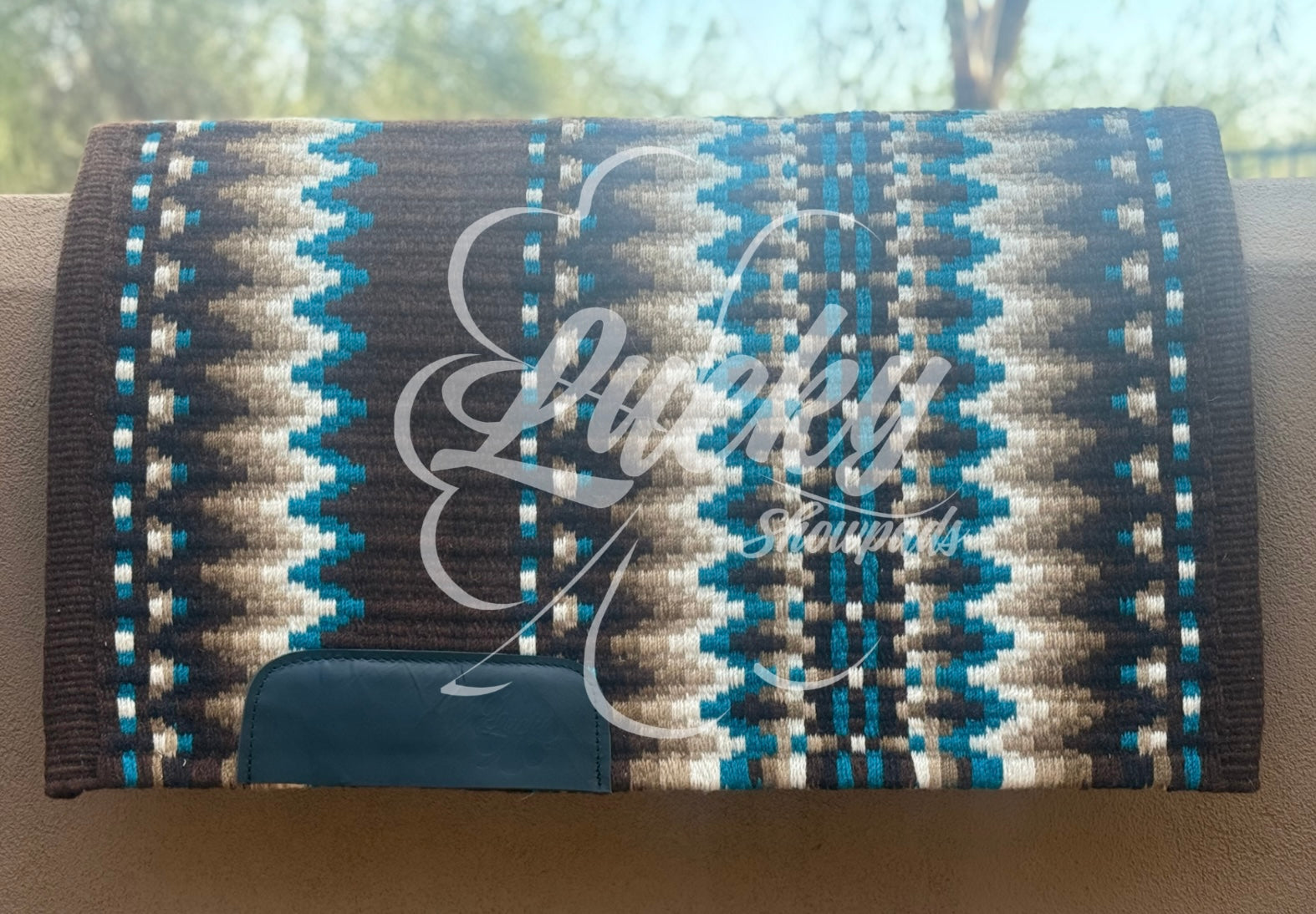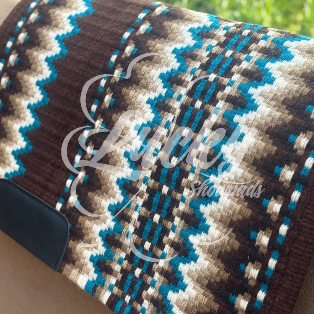 (Chocolate brown base, dark chocolate, tan, sand, cream, turquoise/teal, white)
